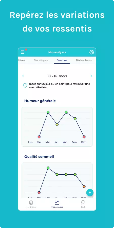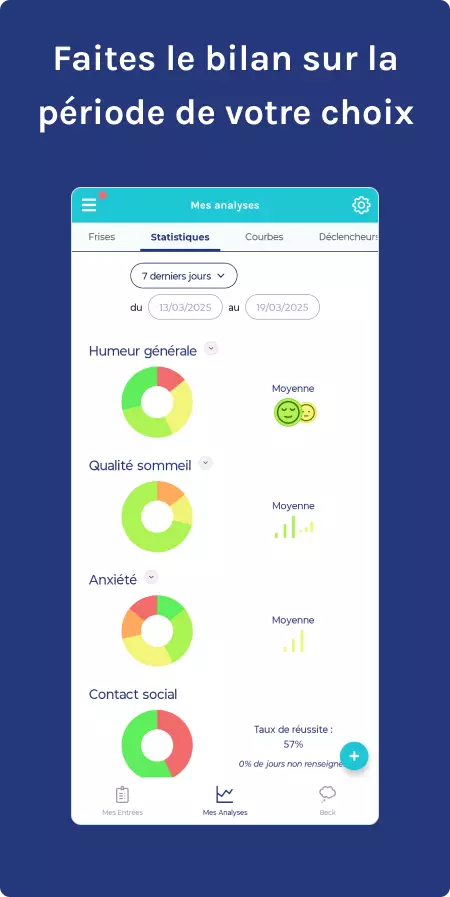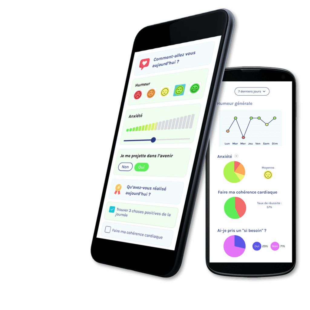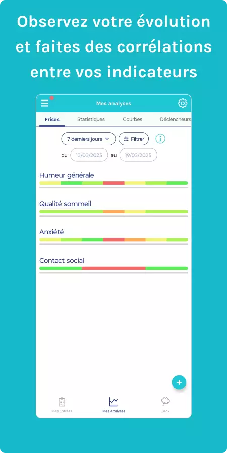 - Outils d’analyse et de visualisation : Statistiques, courbes d’évolution et corrélations pour obtenir une vision globale de l’état psychique et identifier les facteurs d’influence