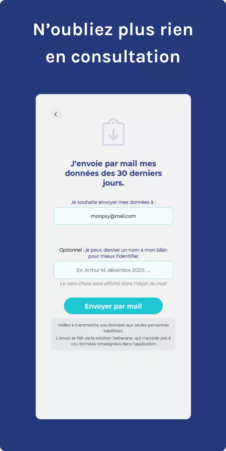 - Questionnaire quotidien personnalisé : Création et suivi d’indicateurs sur mesure (symptômes, ressentis, comportements, pensées) avec une échelle simple de smileys colorés pour évaluer l’intensité